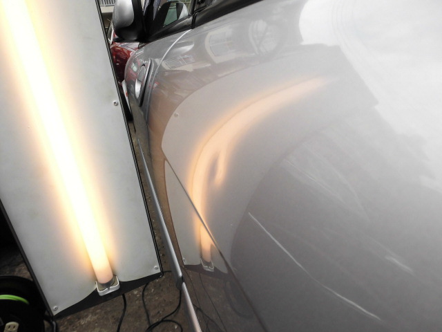 そんなに深いヘコミでも無いようですがヘコミが結構広範囲に及んでおります。ヘコミを直して全体のバランスをとる作業になりそうです。(^^ゞ