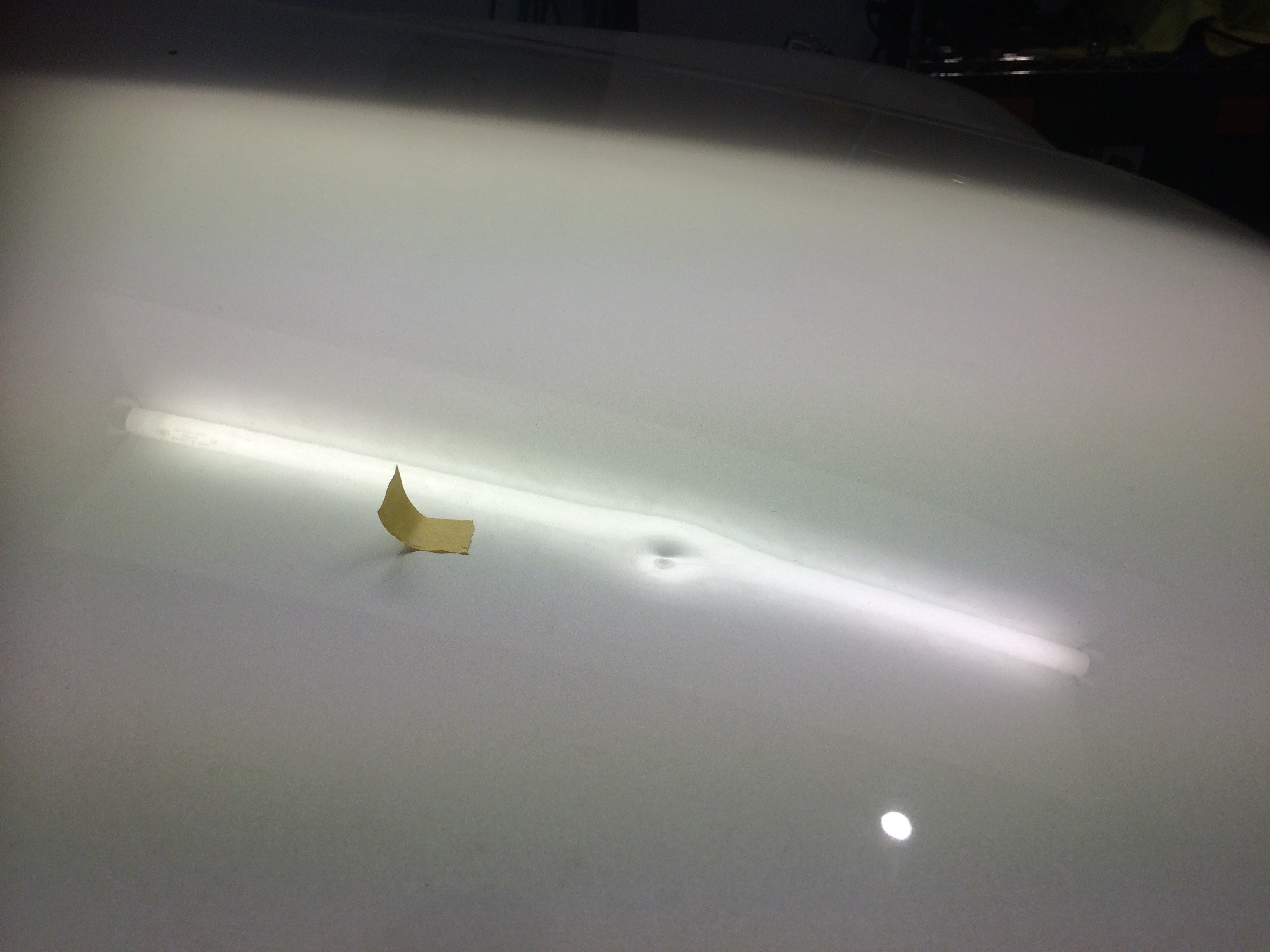 ボンネットのやや右寄りにクッキリと凹んでおります。結構一点集中の深めの凹みです。(^_^;)